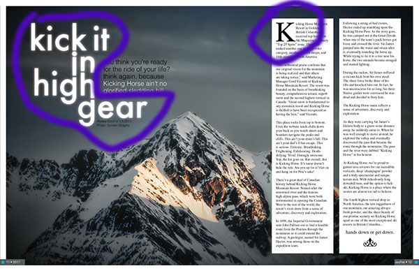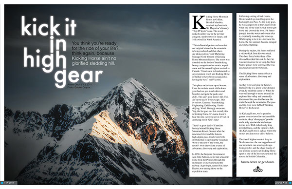 Using the photography of Leading Lines, Rule of thirds, and Depth of field along with the two different typefaces of Slab serif and Oldschool I think the magazine spread is appealing to the eye and draws the audience in to want o read about this adventure of skiing on the mountain “Kicking horse”.